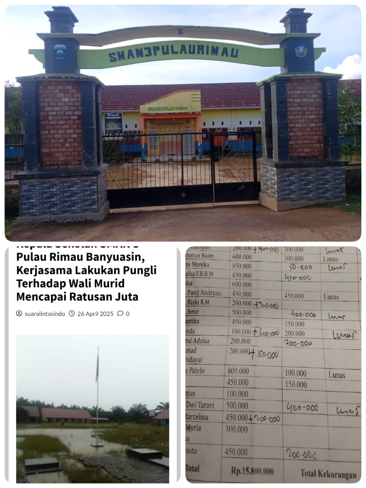 Banyuasin | suaraindependentnews.id- Setelah Viral pemberitaan di media online suaralintasindonesia.com tanggal 26 April 2025 dan tiktok, terkait dugaan tindak pidana korupsi dan pungutan liar yang dilakukan secara bersama-sama oleh Kepala Sekolah beserta Komite Sekolah SMAN 3 Pulau Rimau Kab Banyuasin Provinsi Sumatera Selatan. Tidak mempengaruhi karakter dan berusaha untuk memperbaiki atas tindakan yang mereka lakukan terhadap orang tua wali murid, bahkan setelah berita Viral pun Ketua Komite SMAN 3 Pulau Rimau yang notabene eks/mantan Narapidana korupsi ini, malah membuat gaduh dan menyatakan tidak akan berhenti untuk melakukan Pungli terhadap para orang tua wali murid. Hal ini diucapkan Oleh Ketua Komite pada saat rapat orang tua wali murid kelas 12 sekaligus pengumuman kelulusan. ( Jum’at, 23 Mei 2025 )